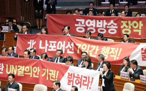 한국당, "공영방송 장악음모' '북 나포여선 7일 행적 밝혀라' 플래카드